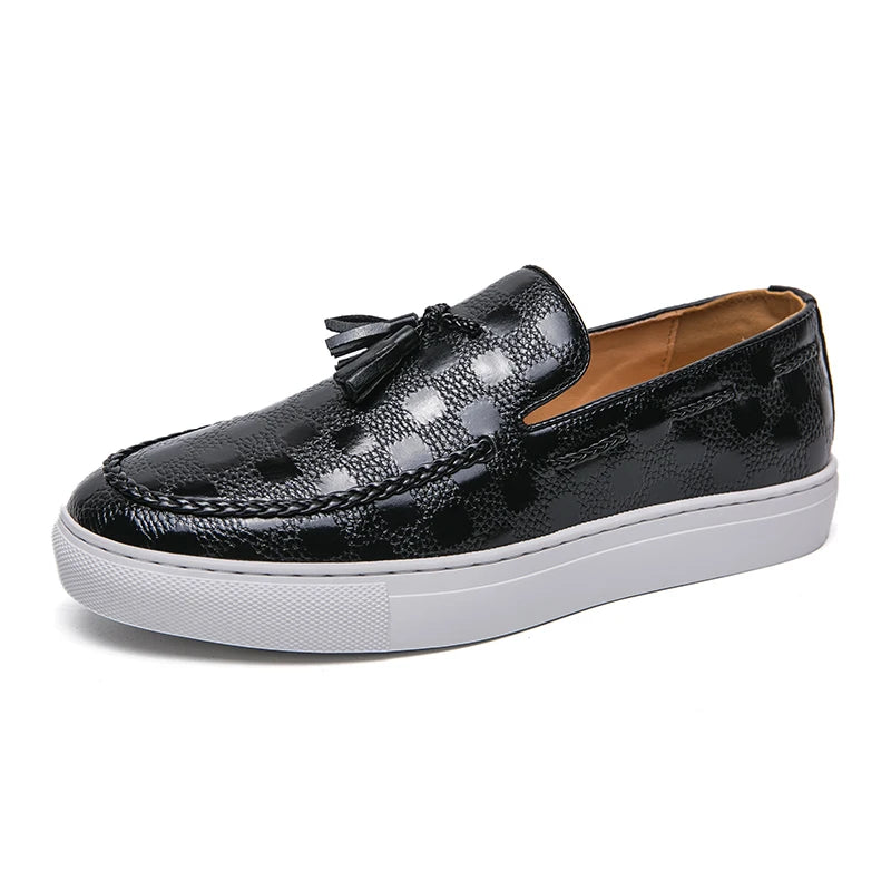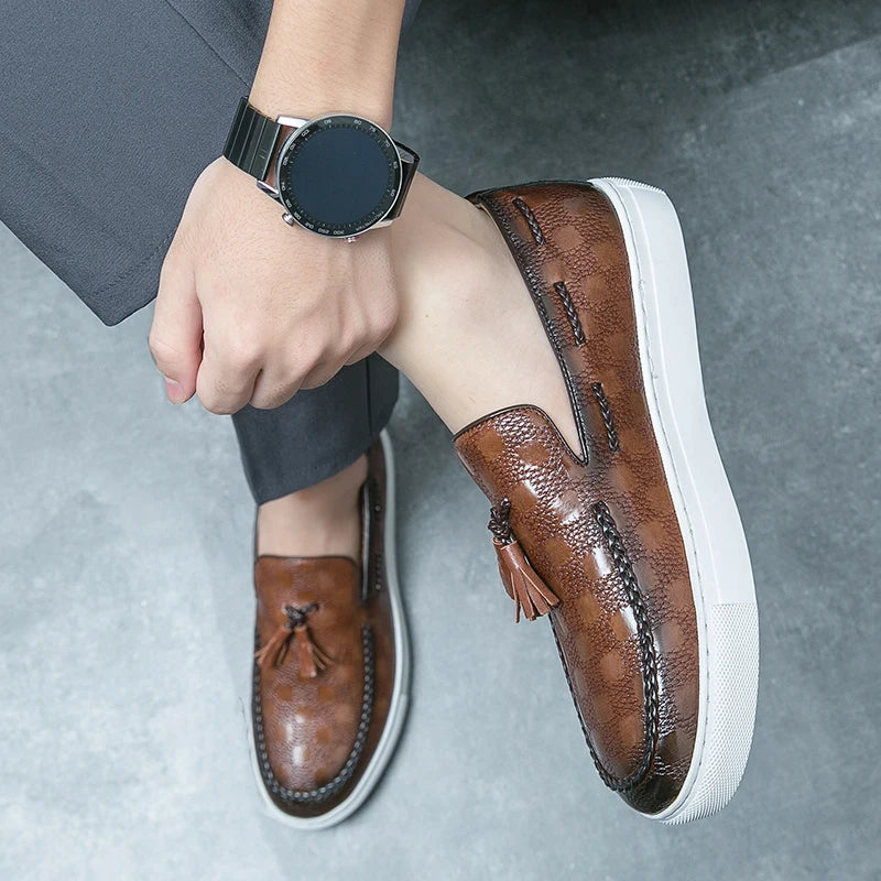 These split leather loafers are all about refined style with a modern twist. The textured check pattern and tassel detail give them a standout look, while the soft lining and flexible sole keep things comfortable. Dressed up or down, they bring effortless polish to any outfit. Clean, sharp, and made to move—these are your new go-to shoes.